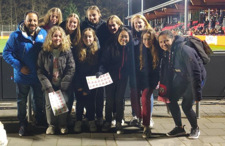 Een groot deel van het team is vrijdagavond op pad geweest. Nee, niet naar de kroeg. Zie het als een soort tactische voorbespreking van de wedstrijd. Locatie: de Herdgang. Jazeker, het trainingscomplex van PSV. Maar ook: de locatie waar de vrouwen van PSV hun wedstrijden spelen. Vrijdagavond speelden de vrouwen van PSV tegen Heerenveen. En ter plekke hebben onze meiden met coach de wedstrijd, door PSV met 1-0 gewonnen, geanalyseerd. Belangrijkste conclusie: de linksbuiten van PSV stond heel veel vrij, maar werd niet aangespeeld. Desondanks gaf zij niet op en bleef ze maar lopen.