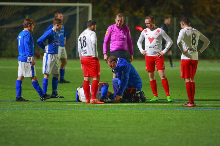 Foto-onderschrift: in de wedstrijd tegen Linschoten lapt Rolf een speler op van Rohda’76. Foto Don van der Meer