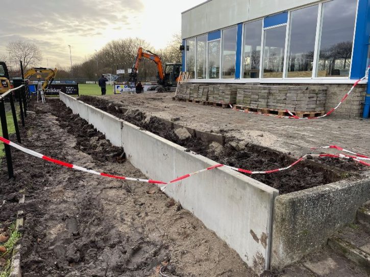 Ze staan keuring overeind: de keerwanden. De afgelopen dagen heeft Bodegraven Flex BV de zware gevaartes waterpas op hun plaats gezet. En daarmee is er weer een flinke stap gezet in de vergroting en upgrading van het terras, zowel aan de kant van veld 2 als het hoofveld.