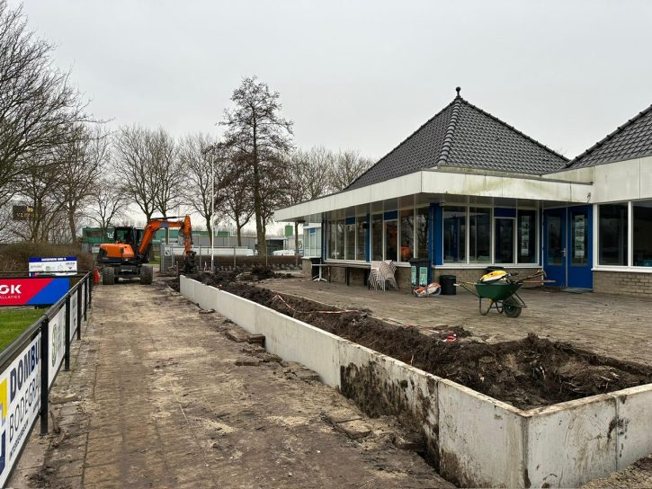 Ze staan keuring overeind: de keerwanden. De afgelopen dagen heeft Bodegraven Flex BV de zware gevaartes waterpas op hun plaats gezet. En daarmee is er weer een flinke stap gezet in de vergroting en upgrading van het terras, zowel aan de kant van veld 2 als het hoofveld.