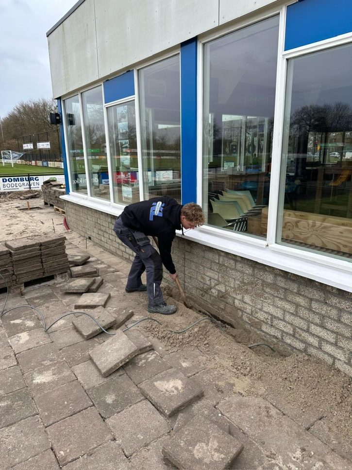Je ziet de omgeving van de kantine steeds meer veranderen. Na het plaatsen van de keerwanden en het aanbrengen van zand, werkt Bodegraven Flex BV nu aan het straatwerk.