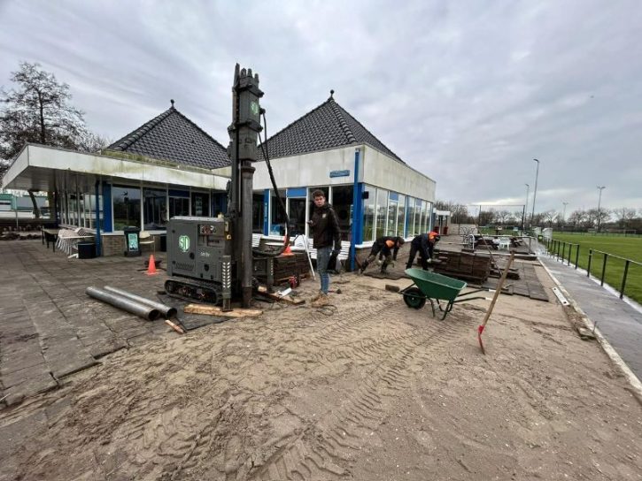 Intussen heeft Schroef Injectie Nederland (het bedrijf van Kees Steinfort) palen in de grond geboord. Daar gaat straks de overkapping op rusten. Om te voorkomen dat er regenwater in de buizen komt, liggen er stenen op de opening van de buizen. Oranje pionnen markeren deze plekken.