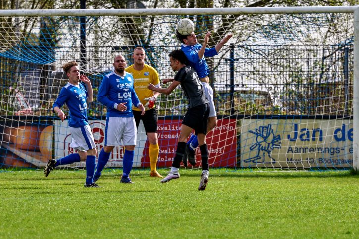 Foto-onderschrift: Lars van der Lugt heerst in de lucht en wint zijn kopduel. Foto Don van der Meer.