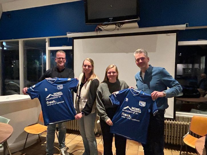 De symbolische overhandiging van de tenues vond eind januari 2025 plaats in de kantine, zoals te zien op de foto. Daar staan v.l.n.r. (Marco Nobel (van het gelijknamige bouwbedrijf), Marieke van Meijeren (aanvoerder Vrouwen-1), Nathalie Matiesing (aanvoerder Vrouwen-2) en Gerben-Jan van der Lugt (Freek Hypotheek).
