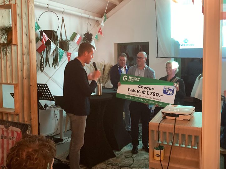 Fantastische boost Maar liefst 25 kavels verwisselde van eigenaar. Zelfs een surprise act ontbrak niet met een duet van Lianne Stolwijk en Arwin Roos die de aanwezigen kippenvel bezorgden met het nummer Vivo per Lei van Andrea Bocelli. Tot slot werden er nog 35 stenen voor de Wall of Legends verkocht en sloten we af met een loterij met een overvolle prijzenpot. Terwijl penningmeester Wulfred Beijeman de laatste telling deed, pianist Ronald Dijk zachter begon te spelen, kregen Bart Lageweg en Marieke de Vos een prachtige cheque uitgereikt van maar liefst € 1.760,- door Arjan Griffioen van Goudriaan Jongerius (zie foto) met lovende woorden voor de inzet van bestuur en Marieke de Vos als ‘hoofd’ van de keuken. Samen met de veilingopbrengst van € 16.500,- en de steentjes van € 2.500,- bracht deze avond ruim € 20.000, – op. Een fantastische boost voor de nieuwe keuken!