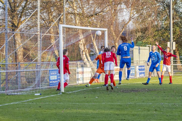Foto-onderschriften: 1. Met een fraaie lob schildert Bram Plomp de 1-1 op het scorebord 2. Jeroen Schouten kopt van dichtbij de 1-3 binnen